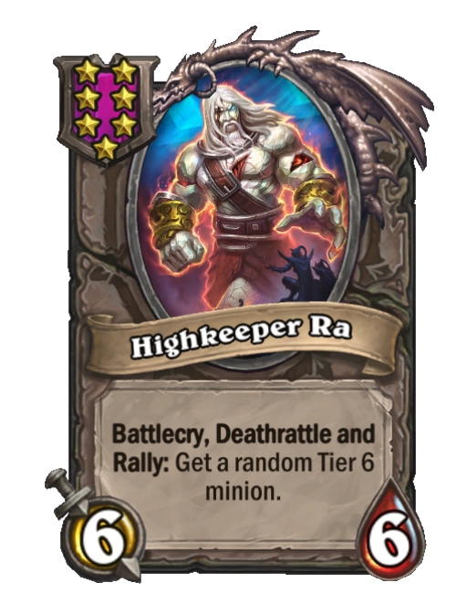 Highkeeper Ra is a Tier 7 Minion in Hearthstone Battlegrounds with 6/6 stats featuring Deathrattle, Battlecry, Rally. Effect: Battlecry, Deathrattle and Rally: Get a random Tier 6 minion.