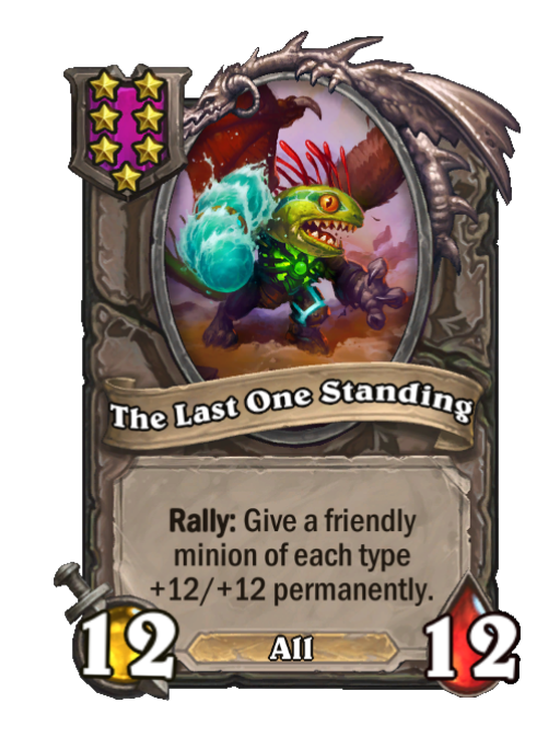 The Last One Standing is a Tier 7 All Minion in Hearthstone Battlegrounds with 12/12 stats featuring Rally. Effect: Rally: Give a friendly minion of each type +12/+12 permanently.