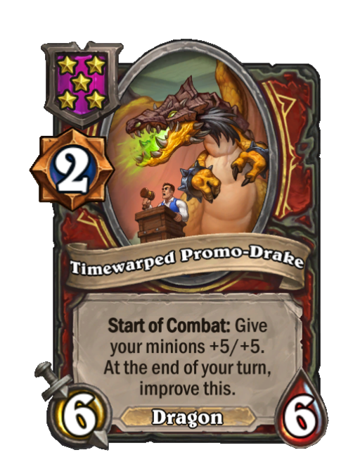 Timewarped Promo-Drake is a Tier 5 Dragon Minion in Hearthstone Battlegrounds with 6/6 stats featuring End of Turn, Start of Combat. Effect: Start of Combat: Give your minions +5/+5. At the end of your turn, improve this.