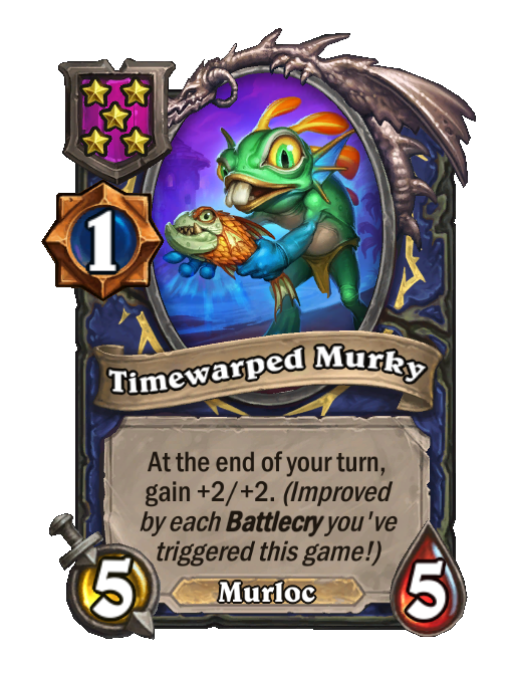 Timewarped Murky is a Tier 5 Murloc Minion in Hearthstone Battlegrounds with 5/5 stats featuring End of Turn. Effect: At the end of your turn, gain +2/+2. (Improved by each Battlecry you've triggered this game!).