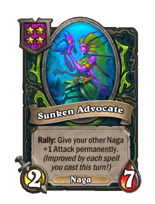 Sunken Advocate is a Tier 4 Naga Minion in Hearthstone Battlegrounds with 2/7 stats featuring Rally. Effect: Rally: Give your other Naga +1 Attack permanently. (Improved by each spell you cast this turn!). This card is no longer in the pool (Legacy).