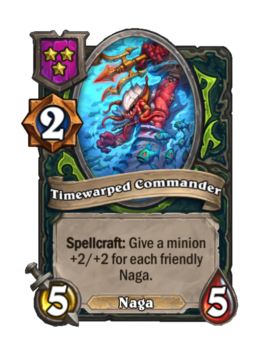 Timewarped Commander is a Tier 3 Naga Minion in Hearthstone Battlegrounds with 5/5 stats featuring Spellcraft. Effect: Spellcraft: Give a minion +2/+2 for each friendly Naga.