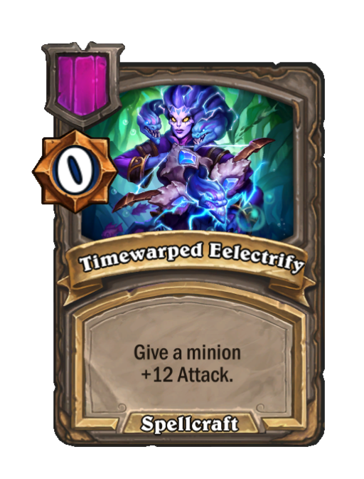 Timewarped Eelectrify is a Spell in Hearthstone Battlegrounds (Timewarped). Effect: Give a minion +12 Attack. Created by: Timewarped Archer. This card is no longer in the pool (Legacy).