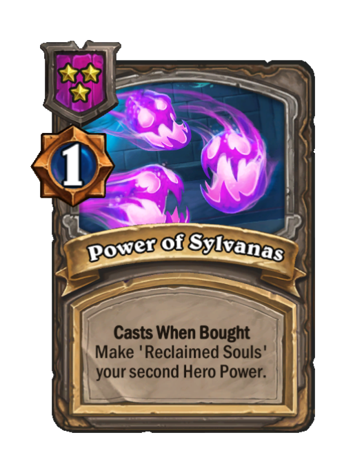 Power of Sylvanas is a Tier 3 Spell in Hearthstone Battlegrounds (Timewarped). Effect: Casts When Bought Make 'Reclaimed Souls' your second Hero Power. Costs 1 Gold.