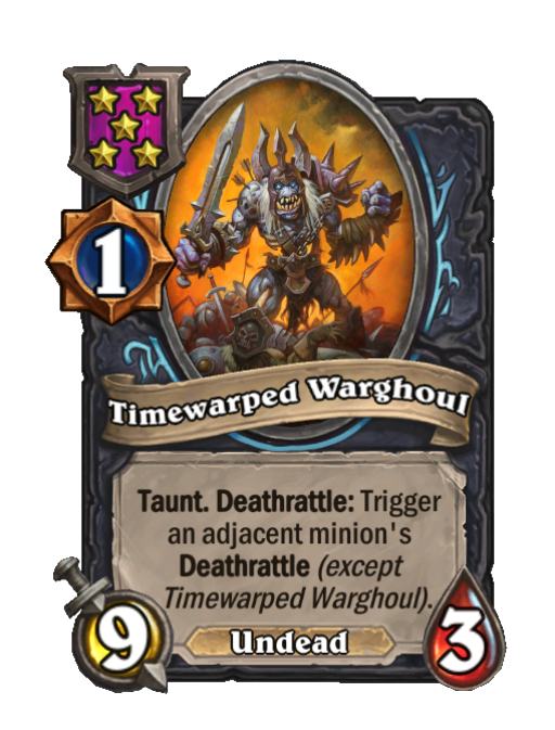 Timewarped Warghoul is a Tier 5 Undead Minion in Hearthstone Battlegrounds with 9/3 stats featuring Taunt, Deathrattle. Effect: Taunt. Deathrattle: Trigger an adjacent minion's Deathrattle (except ___Timewarped Warghoul).