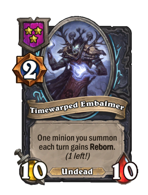 Timewarped Embalmer is a Tier 3 Undead Minion in Hearthstone Battlegrounds with 10/10 stats. Effect: One minion you summon each turn gains Reborn. (1 left!).