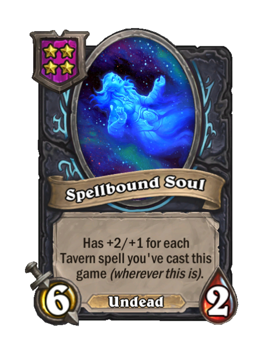 Spellbound Soul is a Tier 4 Undead Minion in Hearthstone Battlegrounds with 6/2 stats featuring Aura. Effect: Has +2/+1 for each Tavern spell you've cast this ___game (wherever this is). This card is no longer in the pool (Legacy).