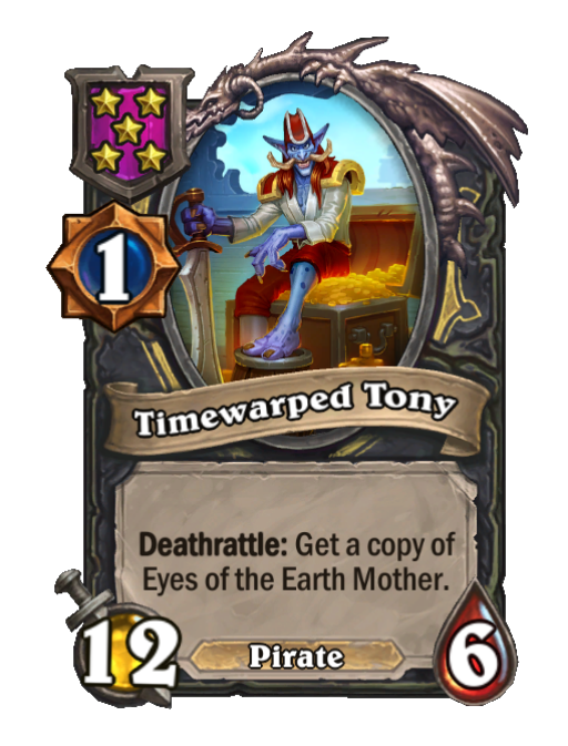 Timewarped Tony is a Tier 5 Pirate Minion in Hearthstone Battlegrounds with 12/6 stats featuring Deathrattle. Effect: Deathrattle: Get a copy of Eyes of the Earth Mother.