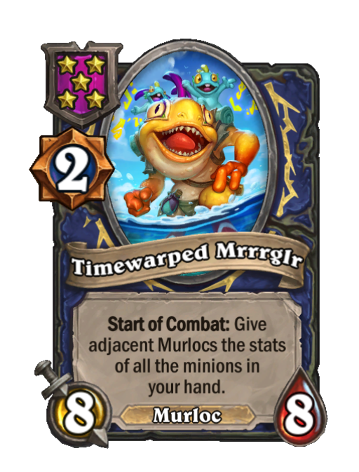 Timewarped Mrrrglr is a Tier 5 Murloc Minion in Hearthstone Battlegrounds with 8/8 stats featuring Start of Combat. Effect: Start of Combat: Give adjacent Murlocs the stats of all the minions in your hand.