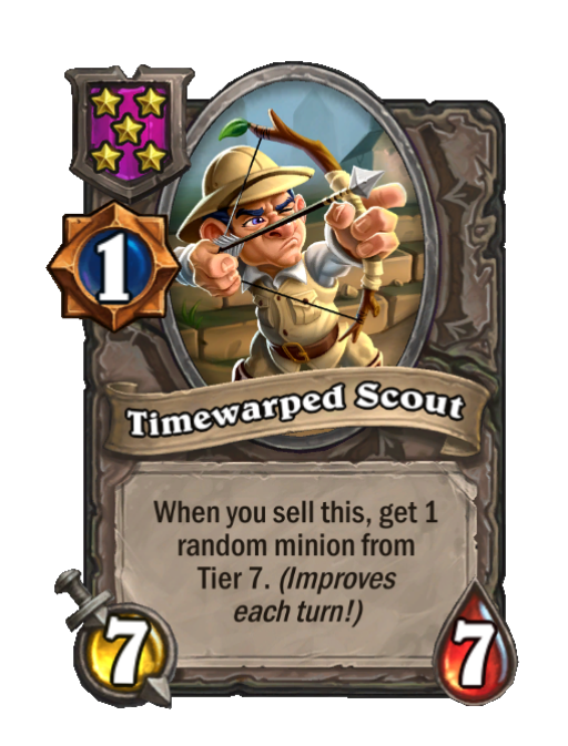 Timewarped Scout is a Tier 5 Minion in Hearthstone Battlegrounds with 7/7 stats. Effect: When you sell this, get 1 random minion from Tier 7. (Improves each turn!).
