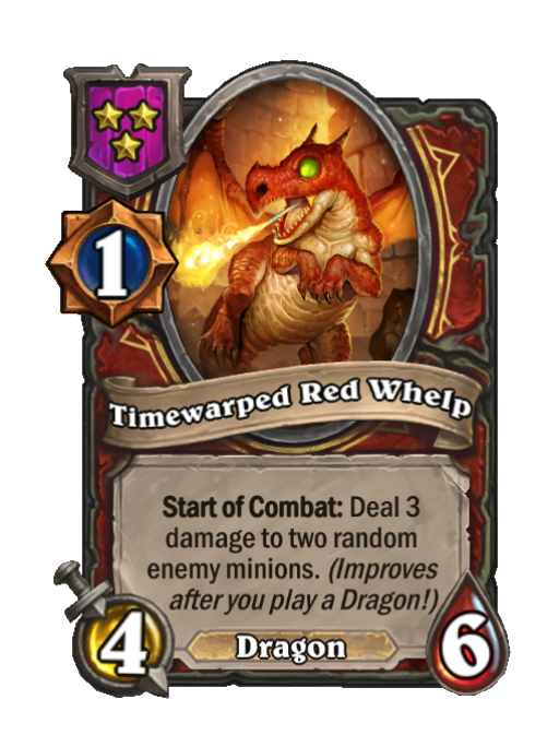 Timewarped Red Whelp is a Tier 3 Dragon Minion in Hearthstone Battlegrounds with 4/6 stats featuring Start of Combat. Effect: Start of Combat: Deal 3 damage to two random enemy minions. (Improves _______after you play a Dragon!)___.