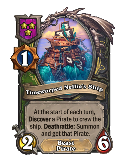 Timewarped Nellie's Ship is a Tier 3 Beast/Pirate Minion in Hearthstone Battlegrounds with 2/6 stats featuring Start of Turn, Discover. Effect: At the start of each turn, Discover a Pirate to crew the ship. Deathrattle: Summon __and get that Pirate.