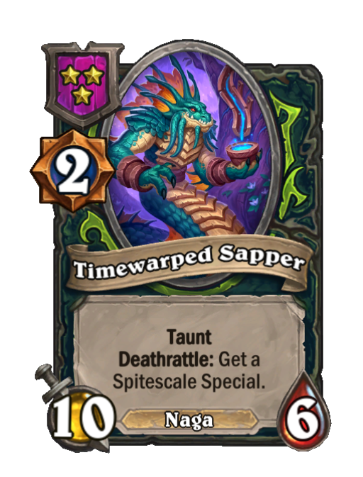 Timewarped Sapper is a Tier 3 Naga Minion in Hearthstone Battlegrounds with 10/6 stats featuring Taunt, Deathrattle. Effect: Taunt Deathrattle: Get a Spitescale Special.