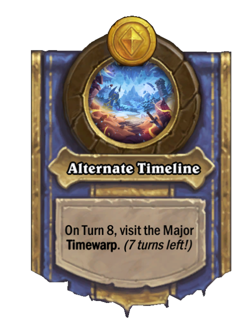 Alternate Timeline is a Hero Power in Hearthstone Battlegrounds. Effect: On Turn 8, visit the Major Timewarp. (7 turns left!). Created by: Murozond, Unbounded.