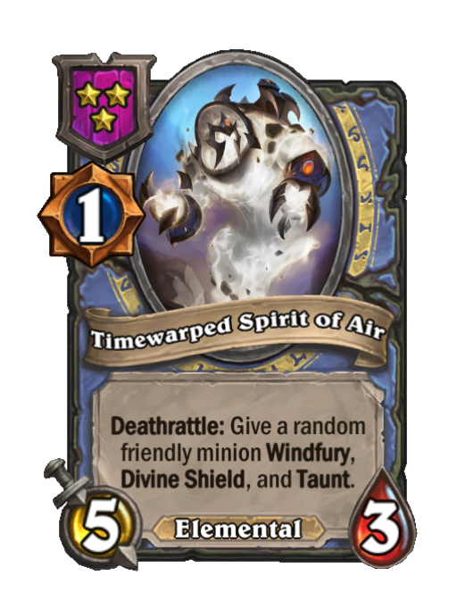 Timewarped Spirit of Air is a Tier 3 Elemental Minion in Hearthstone Battlegrounds with 5/3 stats featuring Deathrattle. Effect: Deathrattle: Give a random friendly minion Windfury, ___Divine Shield, and Taunt.___. This card is no longer in the pool (Legacy).