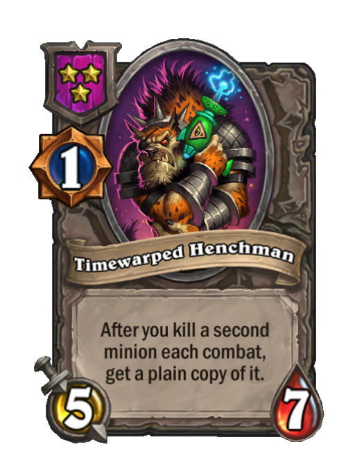 Timewarped Henchman is a Tier 3 Minion in Hearthstone Battlegrounds with 5/7 stats. Effect: After you kill a second minion each combat, get a plain copy of it.