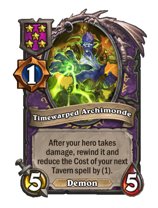 Timewarped Archimonde is a Tier 5 Demon Minion in Hearthstone Battlegrounds with 5/5 stats. Effect: After your hero takes damage, rewind it and reduce the Cost of your next Tavern spell by (1).