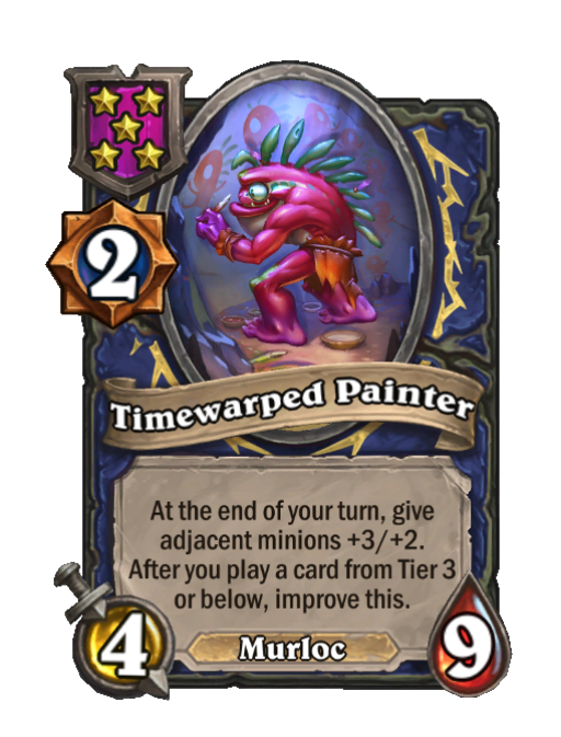 Timewarped Painter is a Tier 5 Murloc Minion in Hearthstone Battlegrounds with 4/9 stats featuring End of Turn. Effect: At the end of your turn, give adjacent minions +3/+2. After you play a card from Tier 3 or below, improve this.