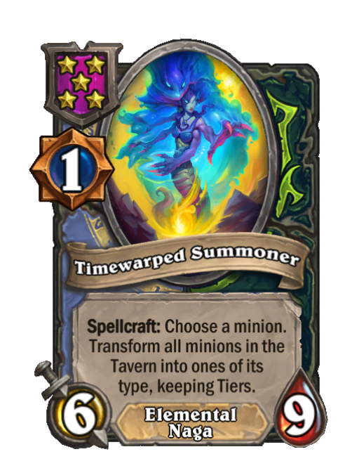 Timewarped Summoner is a Tier 5 Elemental/Naga Minion in Hearthstone Battlegrounds with 6/9 stats featuring Spellcraft. Effect: Spellcraft: Choose a minion. Transform all minions in the Tavern into ones of its type, keeping Tiers.