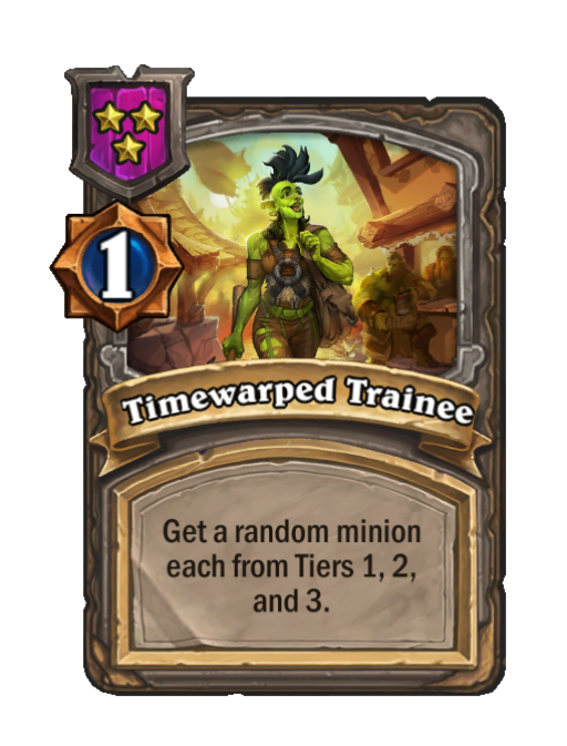 Timewarped Trainee is a Tier 3 Spell in Hearthstone Battlegrounds (Timewarped). Effect: Get a random minion each from Tiers 1, 2, and 3. Costs 1 Gold.