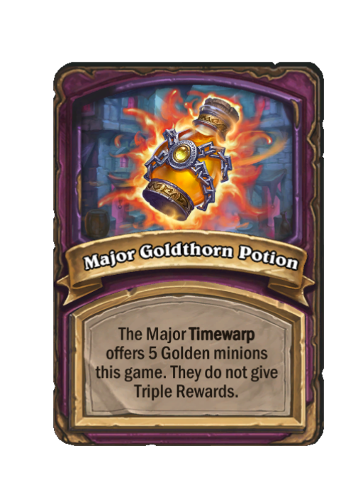 Major Goldthorn Potion is a Anomaly in Hearthstone Battlegrounds. Effect: The Major Timewarp offers 5 Golden minions this game. They do not give Triple Rewards.