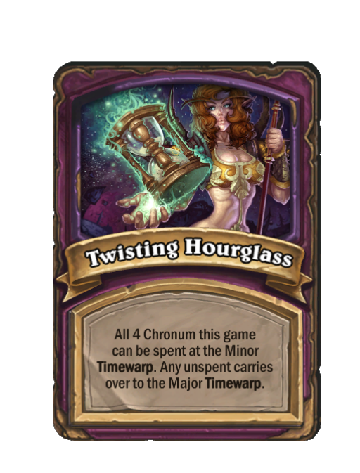 Twisting Hourglass is a Anomaly in Hearthstone Battlegrounds. Effect: All 4 Chronum this game can be spent at the Minor Timewarp. Any unspent carries over to the Major Timewarp.