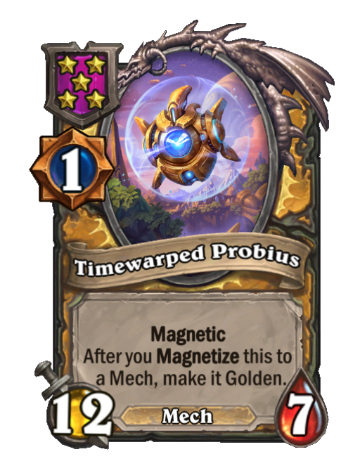 Timewarped Probius is a Tier 5 Mech Minion in Hearthstone Battlegrounds with 12/7 stats featuring Magnetic. Effect: Magnetic After you Magnetize this to __a Mech, make it Golden. This card is no longer in the pool (Legacy).
