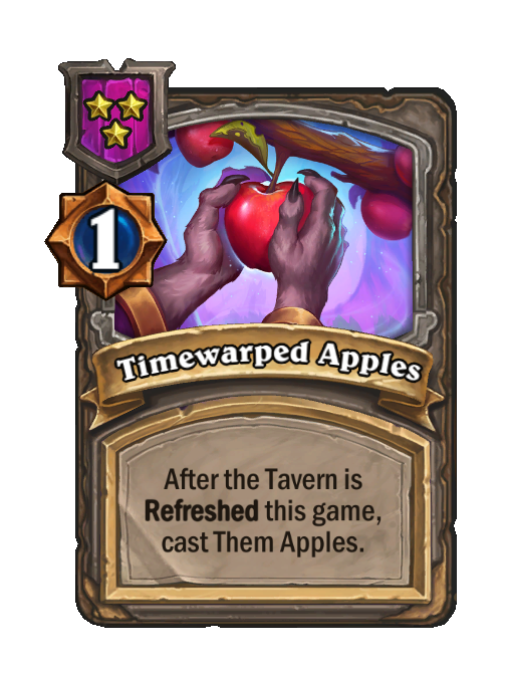 Timewarped Apples is a Tier 3 Spell in Hearthstone Battlegrounds (Timewarped). Effect: After the Tavern is Refreshed this game, cast Them Apples. Costs 1 Gold. This card is no longer in the pool (Legacy).