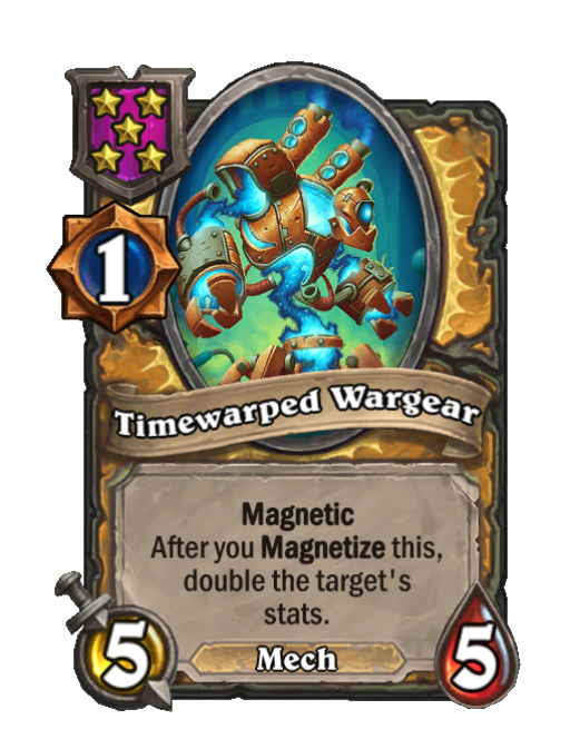 Timewarped Wargear is a Tier 5 Mech Minion in Hearthstone Battlegrounds with 5/5 stats featuring Magnetic. Effect: Magnetic After you Magnetize this, double the target's stats.