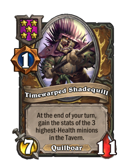 Timewarped Shadequill is a Tier 5 Quilboar Minion in Hearthstone Battlegrounds with 7/11 stats featuring End of Turn. Effect: At the end of your turn, gain the stats of the 3 highest-Health minions in the Tavern.