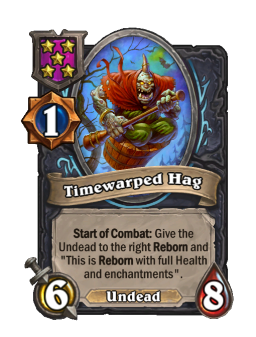 Timewarped Hag is a Tier 5 Undead Minion in Hearthstone Battlegrounds with 6/8 stats featuring Start of Combat. Effect: Start of Combat: Give the Undead to the right Reborn and "This is Reborn with full Health and enchantments".