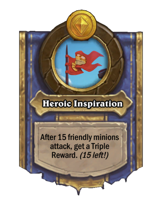 Heroic Inspiration is a Hero Power in Hearthstone Battlegrounds. Effect: After 15 friendly minions attack, get a Triple Reward. (15 left!). Created by: Loh, the Living Legend.