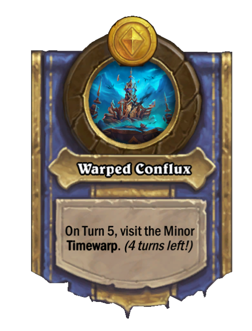Warped Conflux is a Hero Power in Hearthstone Battlegrounds. Effect: On Turn 5, visit the Minor Timewarp. (4 turns left!). Created by: Morchie.