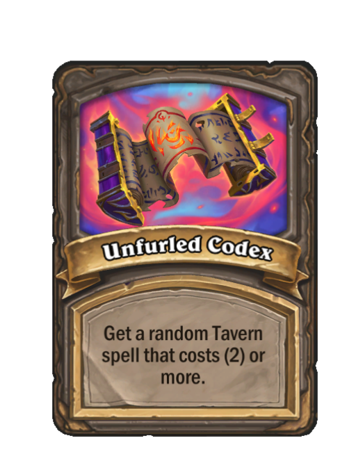 Unfurled Codex is a Tier 1 Spell in Hearthstone Battlegrounds (Darkmoon). Effect: Get a random Tavern spell that costs (2) or more. This card is no longer in the pool (Legacy).
