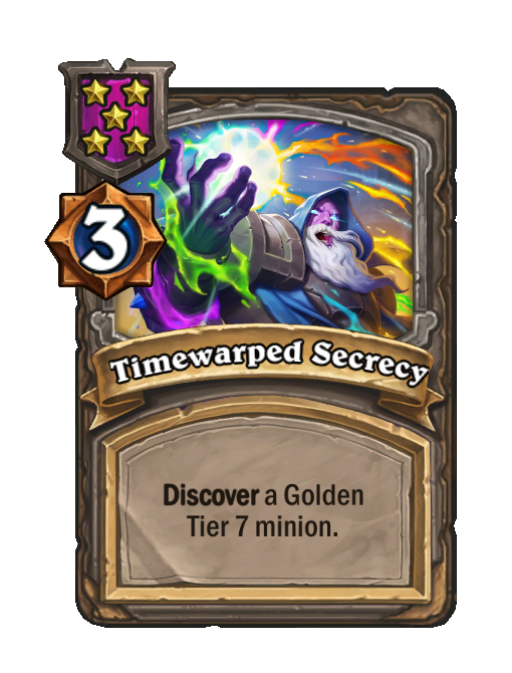 Timewarped Secrecy is a Tier 5 Spell in Hearthstone Battlegrounds featuring Discover (Timewarped). Effect: Discover a Golden Tier 7 minion. Costs 3 Gold. This card is no longer in the pool (Legacy).