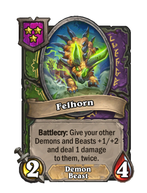 Felhorn is a Tier 3 Demon/Beast Minion in Hearthstone Battlegrounds with 2/4 stats featuring Battlecry. Effect: Battlecry: Give your other Demons and Beasts +1/+2 and deal 1 damage to them, twice.