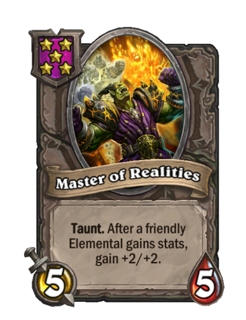 Master of Realities is a Tier 5 Minion in Hearthstone Battlegrounds with 5/5 stats featuring Taunt. Effect: Taunt. After a friendly Elemental gains stats, gain +1/+1. This card is no longer in the pool (Legacy).