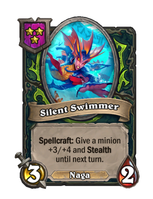 Silent Swimmer is a Tier 3 Naga Minion in Hearthstone Battlegrounds with 3/2 stats. Effect: Spellcraft: Give a minion +3/+5 and Stealth until next turn. This card is no longer in the pool (Legacy).