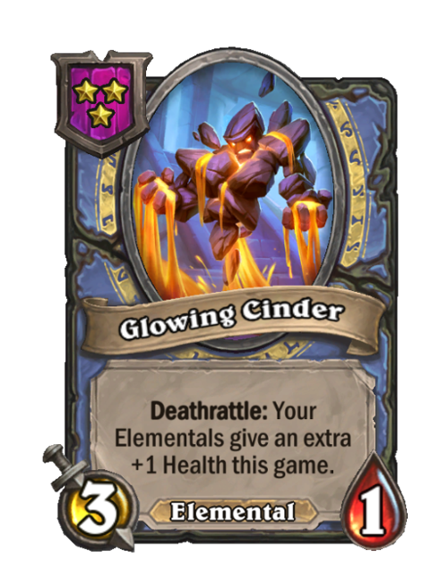 Glowing Cinder is a Tier 3 Elemental Minion in Hearthstone Battlegrounds with 3/1 stats featuring Deathrattle. Effect: Deathrattle: Your Elementals that give stats grant an extra +1 Attack this game. This card is no longer in the pool (Legacy).