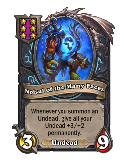 Noisul of the Many Faces is a Tier 6 Undead Minion in Hearthstone Battlegrounds with 3/9 stats. Effect: Whenever you summon an Undead, give all your Undead +2/+1 permanently. This card is no longer in the pool (Legacy).