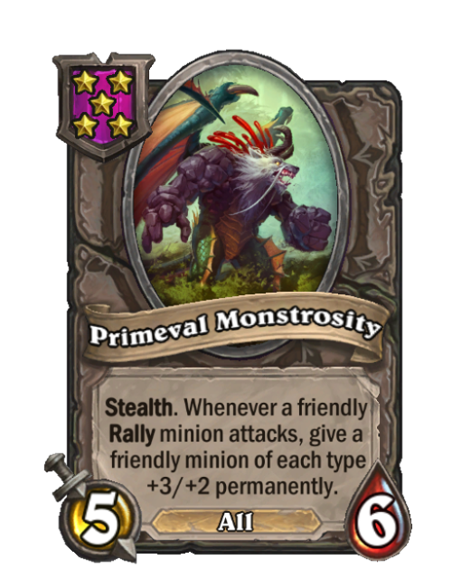 Primeval Monstrosity is a Tier 5 All Minion in Hearthstone Battlegrounds with 5/6 stats featuring Stealth. Effect: Stealth. Whenever a friendly Rally minion attacks, give a friendly minion of each type +3/+3 permanently. This card is no longer in the pool (Legacy).