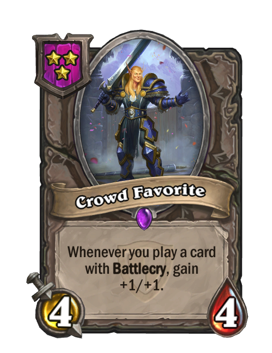 Crowd Favorite is a Tier 3 Minion in Hearthstone Battlegrounds with 4/4 stats. Effect: Whenever you play a card with Battlecry, gain +1/+1. This card is no longer in the pool (Legacy).