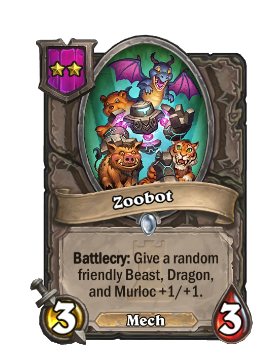 Zoobot is a Tier 2 Mech Minion in Hearthstone Battlegrounds with 3/3 stats featuring Battlecry. Effect: Battlecry: Give a random friendly Beast, Dragon, and Murloc +1/+1. This card is no longer in the pool (Legacy).