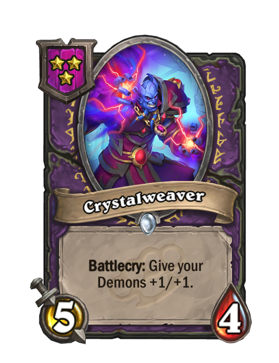 Crystalweaver is a Tier 3 Minion in Hearthstone Battlegrounds with 5/4 stats featuring Battlecry. Effect: Battlecry: Give your Demons +1/+1. This card is no longer in the pool (Legacy).
