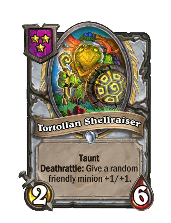 Tortollan Shellraiser is a Tier 3 Minion in Hearthstone Battlegrounds with 2/5 stats featuring Deathrattle, Taunt. Effect: Taunt Deathrattle: Give a random friendly minion +1/+1. This card is no longer in the pool (Legacy).