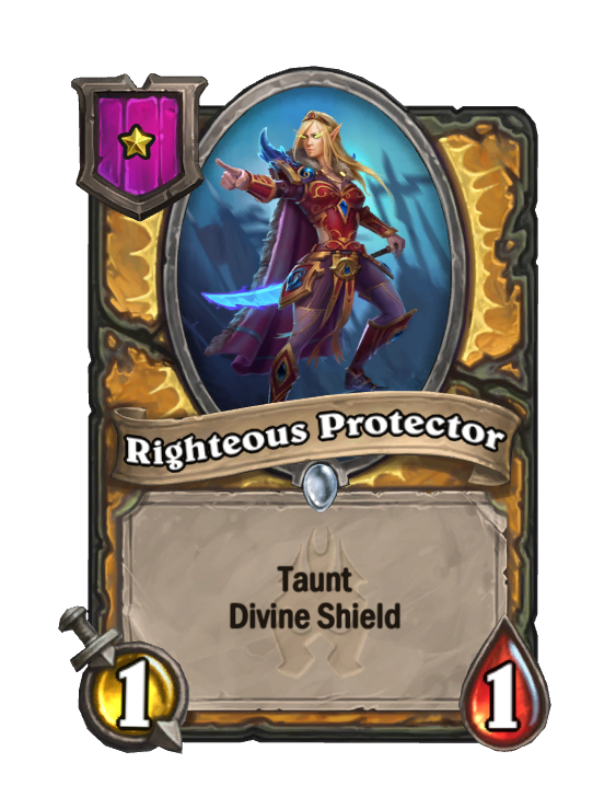Righteous Protector is a Tier 1 Minion in Hearthstone Battlegrounds with 1/1 stats featuring Taunt, Divine Shield. Effect: Taunt Divine Shield. This card is no longer in the pool (Legacy).