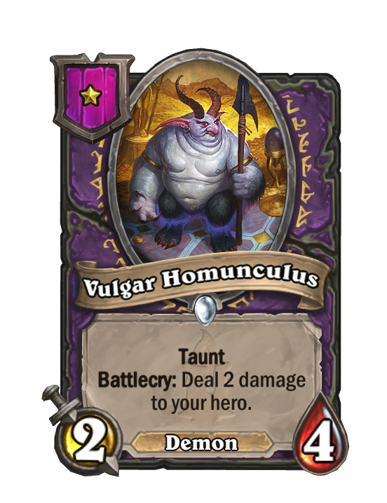 Vulgar Homunculus is a Tier 1 Demon Minion in Hearthstone Battlegrounds with 2/4 stats featuring Battlecry, Taunt. Effect: Taunt Battlecry: Deal 2 damage to your hero. This card is no longer in the pool (Legacy).