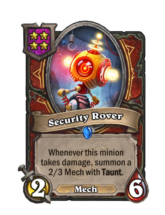 Security Rover is a Tier 4 Mech Minion in Hearthstone Battlegrounds with 2/6 stats. Effect: Whenever this minion takes damage, summon a 2/3 Mech with Taunt. This card is no longer in the pool (Legacy).