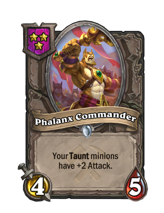 Phalanx Commander is a Tier 3 Minion in Hearthstone Battlegrounds with 4/5 stats. Effect: Your Taunt minions have +2 Attack. This card is no longer in the pool (Legacy).