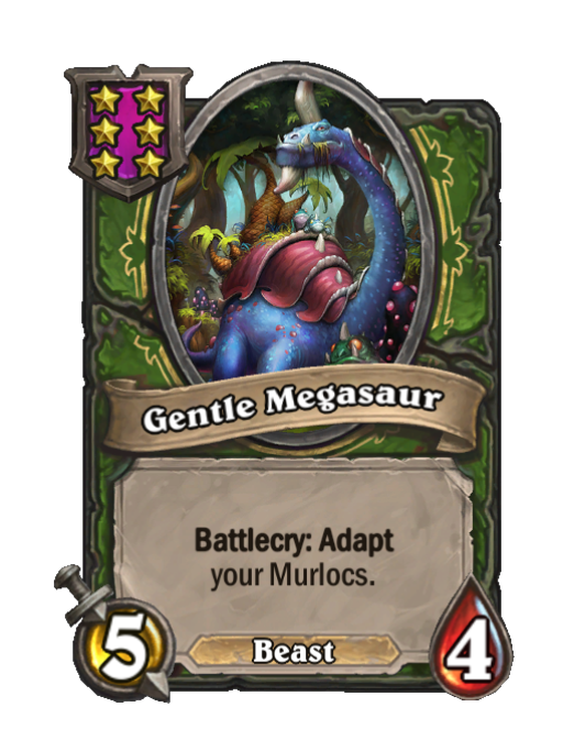 Gentle Megasaur is a Tier 6 Beast Minion in Hearthstone Battlegrounds with 5/4 stats featuring Battlecry. Effect: Battlecry: Adapt your_Murlocs. This card is no longer in the pool (Legacy).
